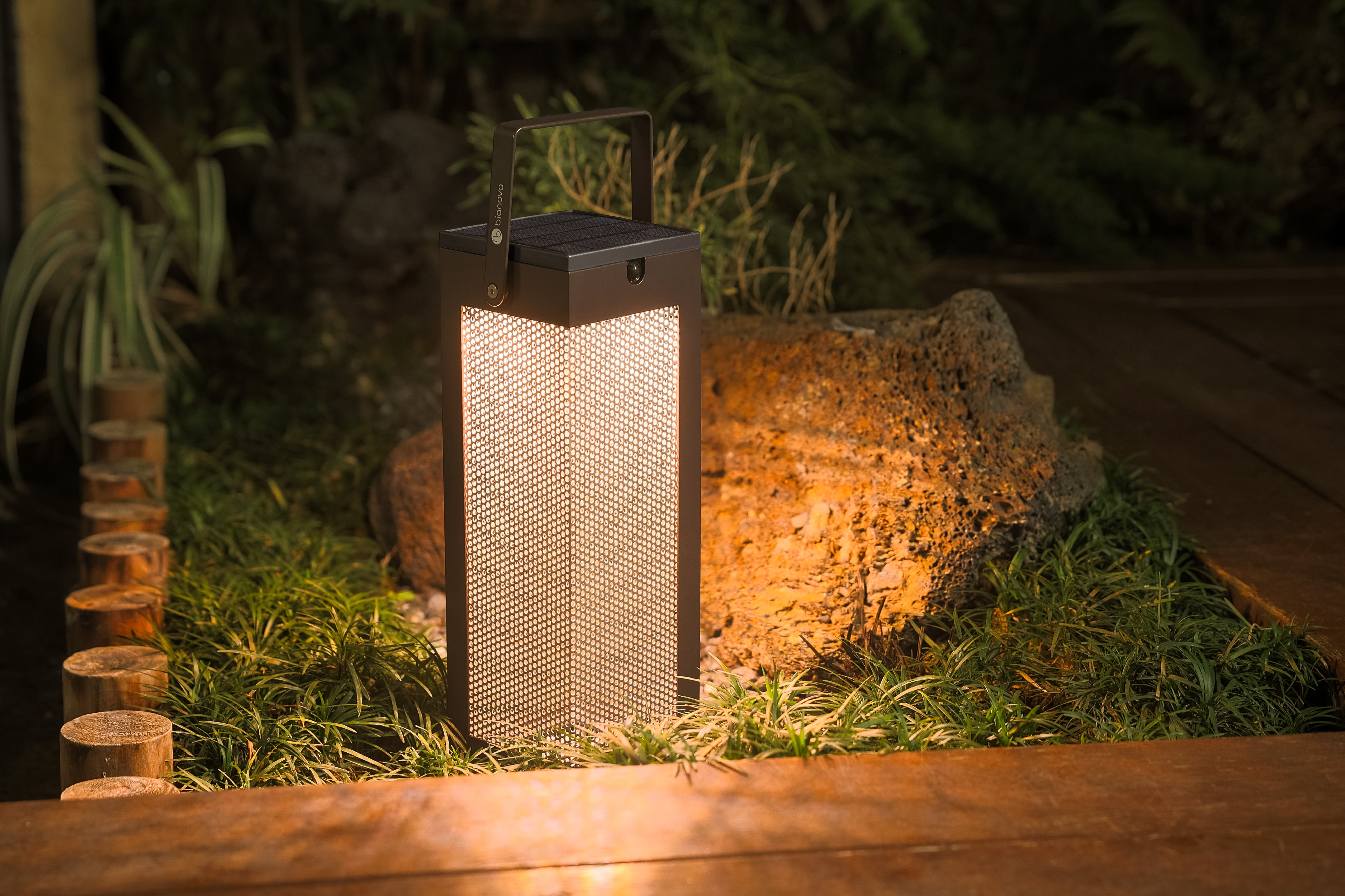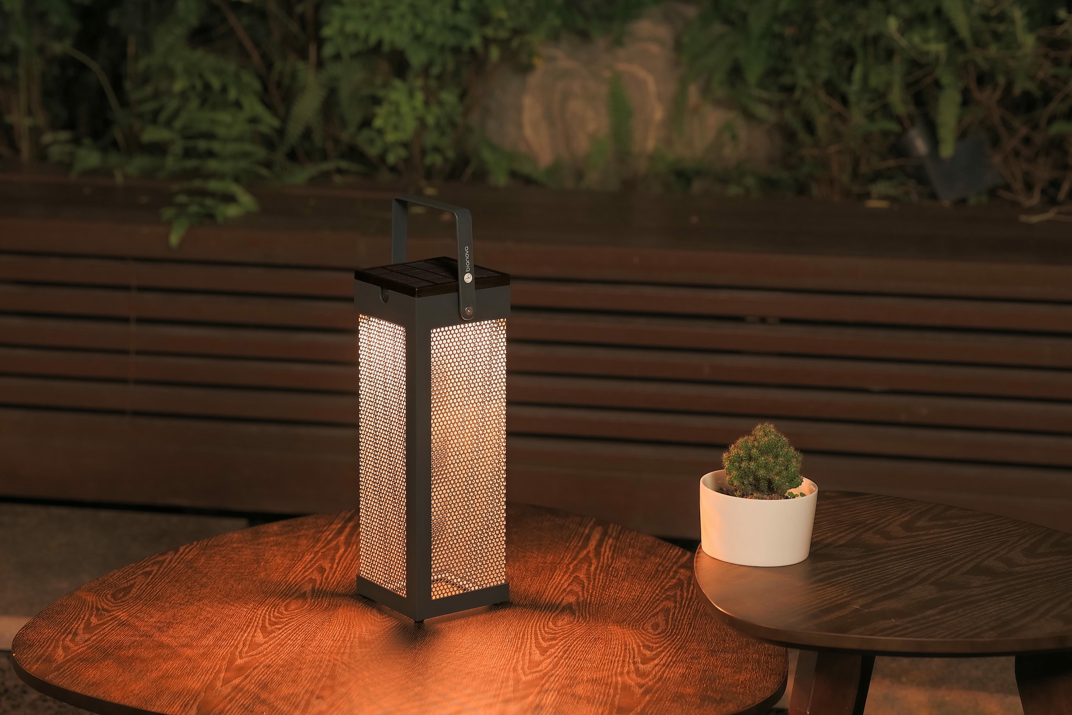 Featuring a geometric design, solar table light Khoom has sharp edges and an aluminum mesh lampshade that allows light to pass through. This fosters interaction with users and the environment while creating stunning lighting patterns.